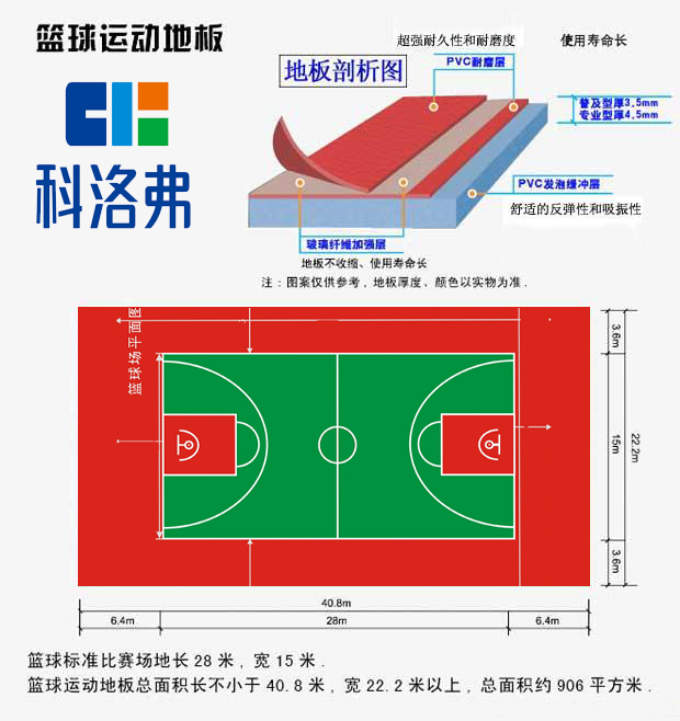 籃球運動起源于美國。籃球地板多使用10年至20年間的美國楓木地板鋪設(shè)而成,但是由于其造價昂貴,國內(nèi)多數(shù)場館均采用國產(chǎn)楓木地板鋪設(shè)。近年來,隨著塑膠地板技術(shù)進入我國和塑膠地板行業(yè)的興起,籃球塑膠運動地板在國內(nèi)已經(jīng)普遍被大眾所接受,因其良好的運動特性,深受廣大球員的喜愛。籃球塑膠運動地板在國內(nèi)還是一個新型的地板類型,具有很大的發(fā)展空間。籃球運動地板板材規(guī)格通覽: 單卷寬1.8m 卷長20m 面層紋理:楓木紋/寶石紋/布紋 總厚度:4.5mm/其他 場地線總長寬:28mX15m 地板總長寬:40mX20m 地板總面積:800㎡