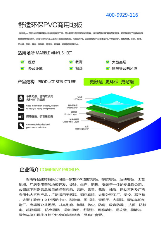 PVC地板是一種以半硬質(zhì)聚氯乙稀,PVC樹脂和天然石粉為主料,在高溫高壓條件下,經(jīng)過特殊生產(chǎn)工藝制成的綠色環(huán)保的新型輕體地面材料。產(chǎn)品紋路逼真美觀、超強(qiáng)耐磨,表面光亮而不滑,環(huán)保無毒、耐磨、耐刮擦,還能防滑、防水、防火等優(yōu)點(diǎn)。現(xiàn)在世界上各大醫(yī)院,幼兒園都以此種材料作為地面裝飾首選材料。