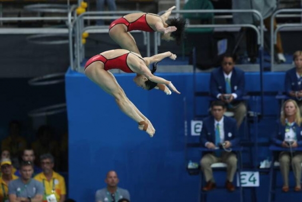 女子雙人三米板決賽中,中國選手吳敏霞和施廷懋以345.60分的總成績奪得冠軍,中國獲第二枚金牌。
