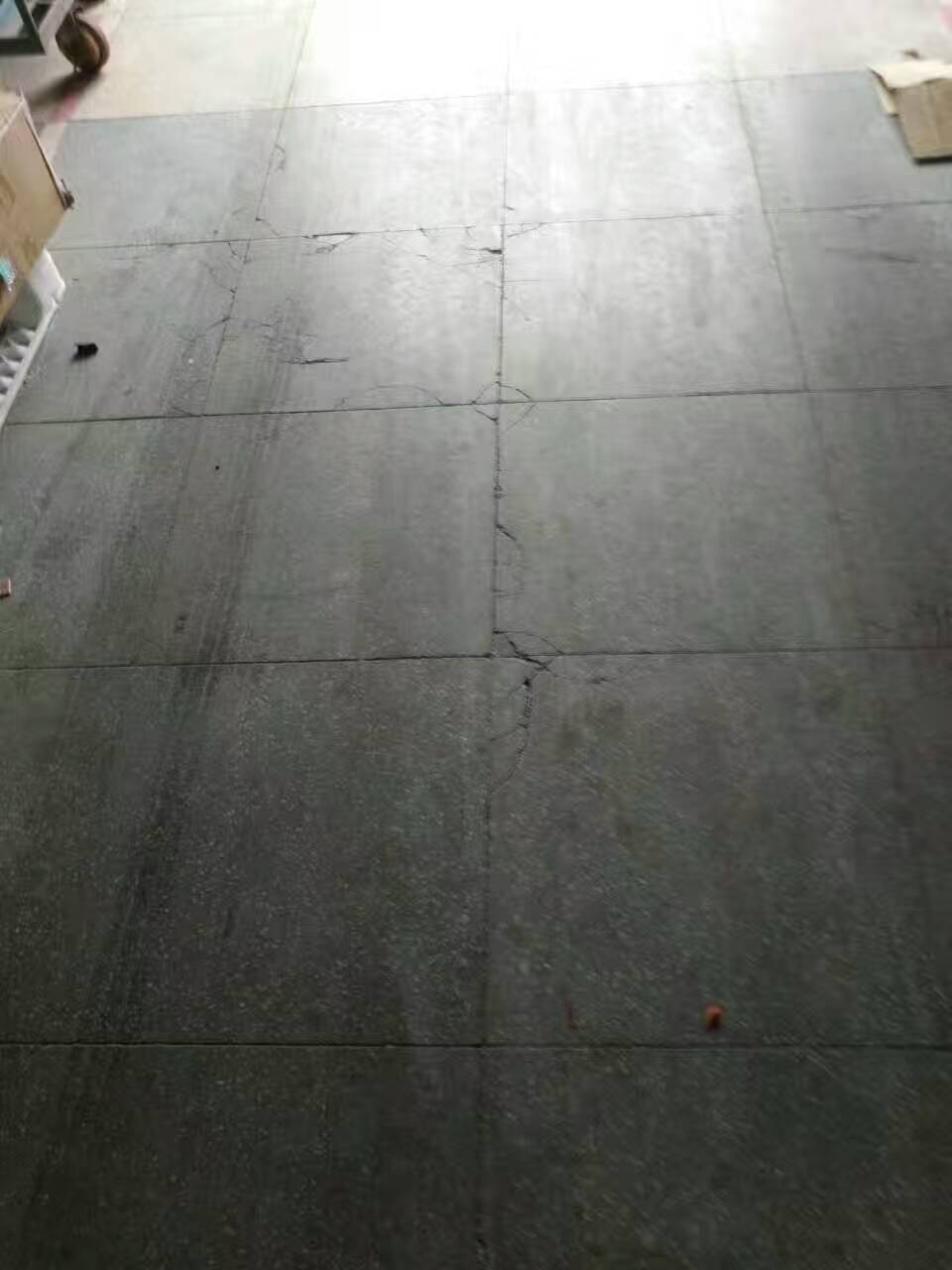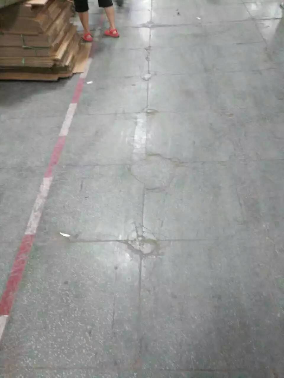 從圖上我們看到這個(gè)廠房的地面已經(jīng)開裂,并且嚴(yán)重影響美觀與日常工作需求了,從地面的損壞程度來看,這個(gè)地面應(yīng)該長(zhǎng)時(shí)間受到重壓,地上有過車留下的刮痕,說明原地面在耐磨耐刮特性上欠缺,抗重壓重載方面欠缺。