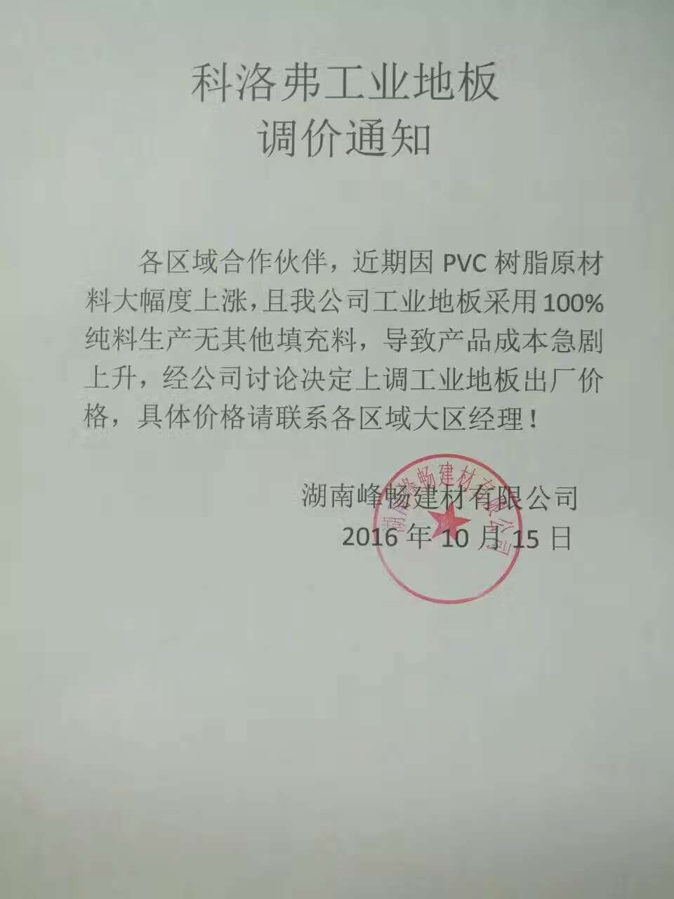 各區(qū)域合作伙伴,近期因PVC樹脂原材料大幅度上漲,且我公司工業(yè)地板采用100%純料生產(chǎn)無(wú)其他填充料,導(dǎo)致產(chǎn)品成本急劇上升,經(jīng)公司討論決定上調(diào)工業(yè)地板出廠價(jià)格,具體價(jià)格請(qǐng)聯(lián)系各區(qū)域大區(qū)經(jīng)理!